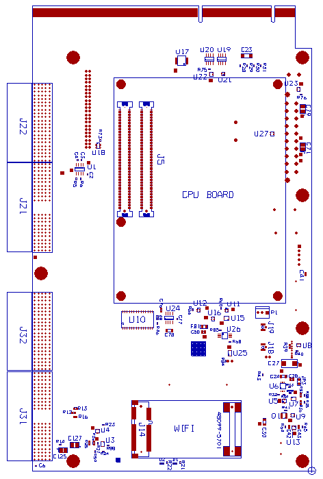 This very unique design is a custom two slot compact PXI motherboard. The slots are arranged vertically at the board edge, rather than horizontally as typically seen in backplane configurations. A standard board edge PCI connector, seen at the top, is used for auxiliary signal I/O. The stack-up consists of 4 signal layers and two ground planes. Controlled impedance traces were used for the SATA, USB, PXI, VGA and LVDS signals. The board size is roughly 6" x 10".
