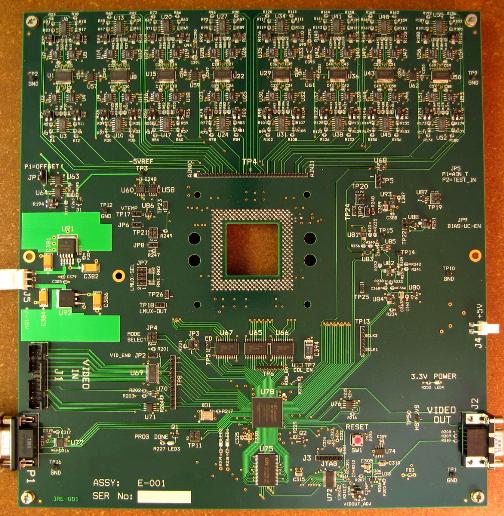 This design was used for testing a video projection chip. The big square cut-out with the PGA is where the DUT plugs in (from the back). The major components consist of Eight DAC8814 DACs with LT1468 OP-Amps used as the I-V converters, and a Xilinx Spartan 3A. Serial NVRAM is used for storing two static test and calibration images.
