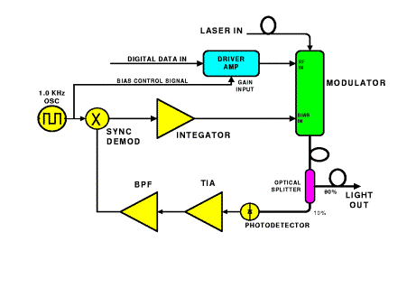 The bias control scheme shown in the block diagram to the left, utilizes a null seeking control loop to keep the bias at the quadrature point. The bias controller outputs a small, low frequency AC signal that is connected to the driver amplifier gain control voltage pin. This signal amplitude modulates (AM) the digital data, which is then applied to the modulators RF input. The amplitude modulated data then amplitude modulates the optical carrier.